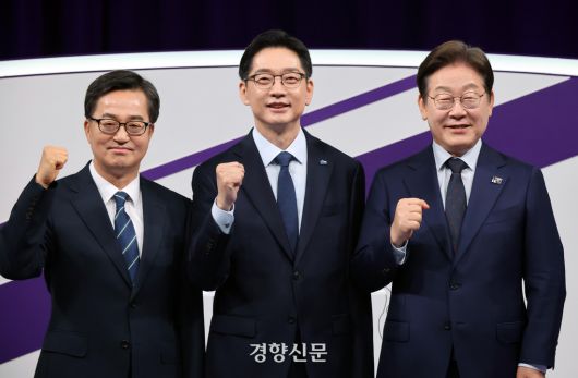 (오른쪽부터) 이재명·김경수·김동연 더불어민주당 대선 경선 후보가 지난 18일 서울 상암동 MBC에서 열린 TV토론회에서 각오를 다지고 있다. 국회사진기자단