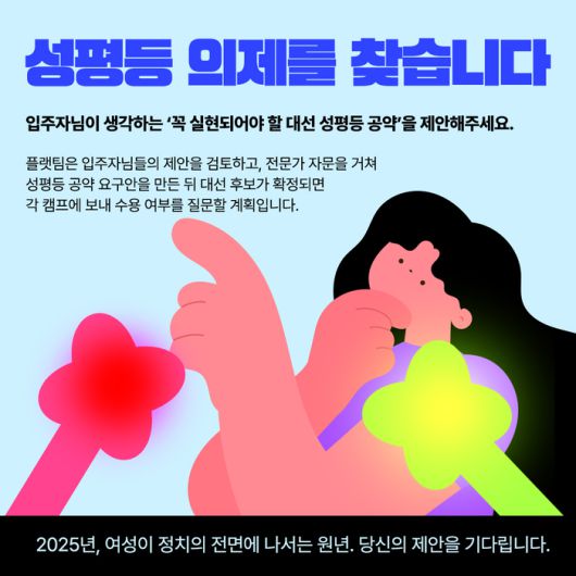 입주자님들이 생각하는 ‘꼭 실현되어야 할 대선 성평등 공약’을 저희에게 제안해주세요. 플랫팀은 입주자님들의 제안을 검토하고, 주요 제안자 인터뷰와 전문가 자문을 거쳐 성평등 공약 요구안을 만들려고 합니다. 주요 정당 대선 후보가 확정되면 각 캠프에 보내 수용 여부도 질문할 계획입니다.