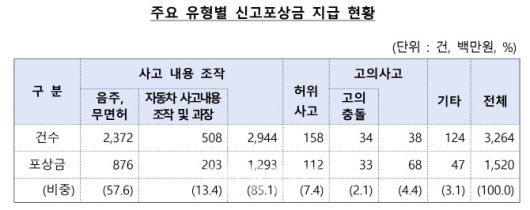 사기유형별로는 사고내용 조작이 85.1%(12억9000만원)로 가장 많고, 그 외 허위사고 7.4%(1억1000만원), 고의사고 4.4%(7000만원) 순이었다.음주·무면허 운전(57.6%), 자동차사고 조작 및 과장(13.4%) 등 자동차 보험사기 제보에 대한 포상금이 높은 비중을 차지했다. 고의충돌 제보의 경우, 건당 포상금 지급 금액은 전년 대비 2배 이상 증가했다.