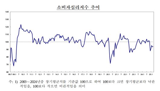 CCSI는 현재생활형편·생활형편전망·가계수입전망·소비지출전망·현재경기판단·향후경기전망 6개 지수를 이용해 산출한 지표다. 100보다 높으면 장기평균(2003∼2024년)과 비교해 소비 심리가 낙관적, 100을 밑돌면 비관적이라는 뜻이다.