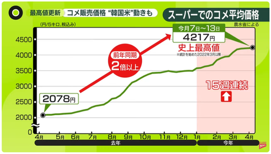 이처럼 한국산 쌀이 일본 시장의 문턱을 넘을 수 있었던 배경에는 일본 쌀값의 급등이 있다. 일본 총무성이 최근 발표한 통계에 따르면 전국 평균 쌀값은 5kg 기준 4214엔(약 4만2000원)으로, 전년 동기 대비 92.1% 상승했다. 특히, 쌀값은 15주 연속 상승세를 이어가며 가계 부담을 더욱 키우고 있다. 일부 매장에서는 kg당 1000엔을 넘는 경우도 적지 않다.