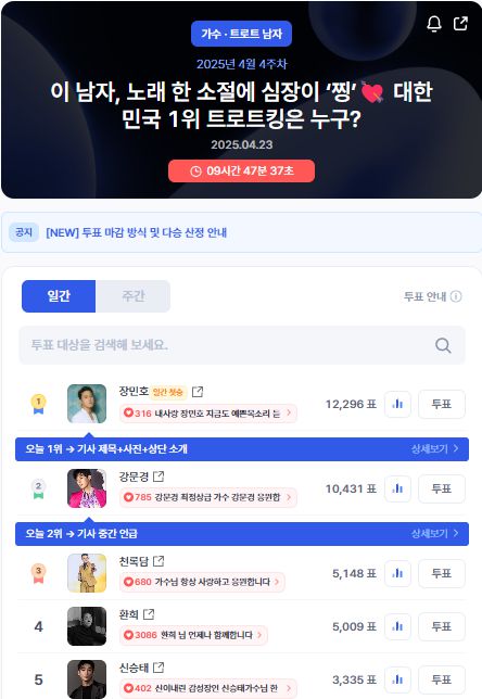 천록담은 23일 오후 2시 11분 기준 디시트렌드(dctrend) 일간 투표 '이 남자, 노래 한 소절에 심장이 '찡' 대한민국 1위 트로트킹은 누구?'에서 5,148표를 얻어 3위를 차지하며 팬들의 뜨거운 지지를 확인했다.