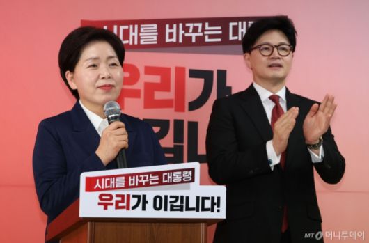 [서울=뉴시스] 조성봉 기자 = 국민의힘 대선 1차 경선에서 컷오프된 양향자(왼쪽) 후보가 23일 오후 서울 여의도 캠프 사무실에서 한동훈 제21대 대통령 선거 국민의힘 경선 후보 지지를 선언하고 있다. 2025.04.23.suncho21@newsis.com /사진=조성봉 |