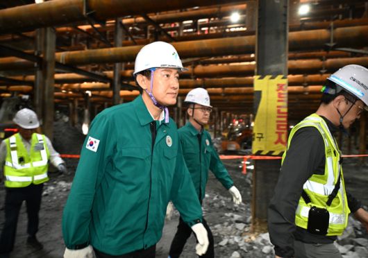 오세훈 서울시장이 23일 영동대로 지하공간 복합개발사업 지하 암반 굴착 현장을 점검하고 있다. 사진=서울시 제공 |
