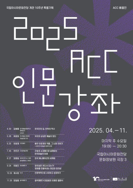 (문화뉴스 노한나 기자) 문화체육관광부 국립아시아문화전당(ACC, 전당장 김상욱)은 올해 개관 10주년을 맞아 4월부터 11월까지 매달 마지막 주 수요일 오후 7시 문화정보원 극장3에서 'ACC 인문강좌'를 진행한다.