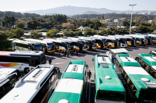 본격적인 수학여행철이 시작된 7일 오전 제주국제공항 대형차량 전용 주차장에 학생들을 기다리는 전세버스가 빼곡히 주차돼 있다.(사진=뉴시스) |