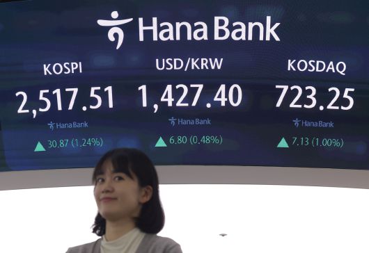 23일 오전 서울 중구 하나은행 본점 딜링룸에서 딜러가 업무를 보고 있다. 이날 코스피는 전날보다 33.92p(1.36%) 오른 2,520.56으로 시작했다. 원/달러 환율은 8.6원 오른 1,429.2원으로, 코스닥은 8.21p(1.15%) 오른 724.33로 개장했다. [연합] |