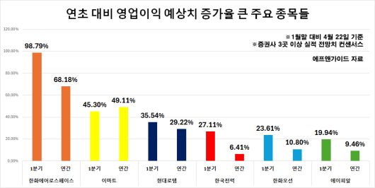 전날 기준 올해 1분기 영업이익 컨센서스는 5022억원으로 지난 1월 말(2526억원)과 비교했을 때 98.79%나 상향 조정됐다. 연간 기준으로도 4월 기준 2조7127억원으로 1월 말(1조6130억원)에 비해 68.18%나 높아졌다. 아직 1분기 실적이 발표되지 않은 코스피 상장사 중에 실적 전망치 상승률에서 독보적인 1위다.