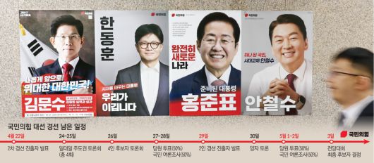 이번에는 당원투표 50%·일반 국민 여론조사 50%(27~28일 실시)를 통해 결과가 발표된다. 후보자 4명 중 과반 득표자가 나오면 29일 최종 후보가 확정된다. 대선 후보로 선출될 수 있는 마지막 관문이 될 수 있다. 다만 과반 득표자가 나오지 않는다면 상위 득표자 2명을 대상으로 5월 1~2일 당원투표·일반 국민 여론조사를 진행해 같은 달 3일 최종 후보를 선출한다.