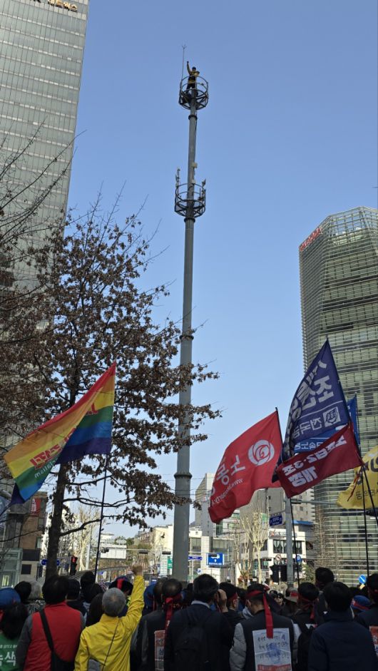 김형수 금속노조 경남지부 거제통영고성 조선하청지회(하청지회) 지회장은 지난달 15일 새벽 4시쯤 서울 한화 본사 앞 30m 높이의 폐쇄회로(CCTV) 철탑에 올랐다.