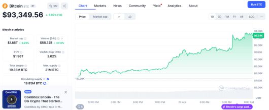 23일 글로벌 가상자산 시황 플랫폼 코인마켓캡 기준 오전 9시 30분께 비트코인 가격은 전일 대비 6.92% 상승한 9만3349달러에 거래되고 있다. 비트코인이 9만3000달러 선을 넘어선 것은 3월 3일 이후 약 50여일 만이다.