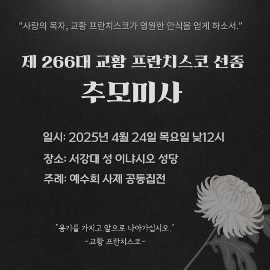 한편 프란치스코 교황의 장례미사는 오는 26일 10시(현지 시간) 바티칸 성 베드로 대성당에서 엄수될 예정이다.