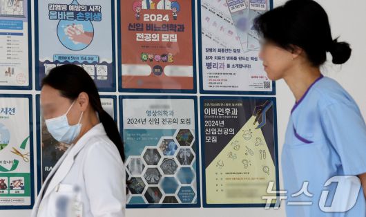 31일 오후 서울시내의 한 대학병원 내 전공의 모집 공고 안내문 앞으로 의료진이 지나가고 있다. 2024.7.31/뉴스1 ⓒ News1 장수영 기자 |