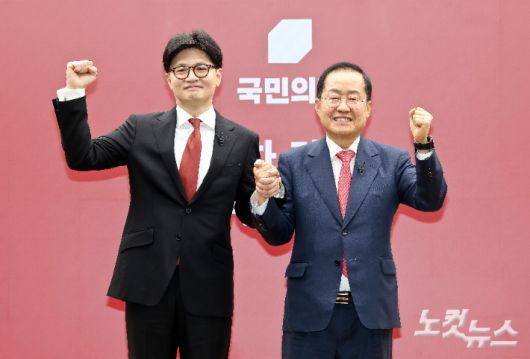 국민의힘 한동훈 대선 경선 후보와 홍준표 대선 경선 후보가 23일 서울 여의도 국민의힘 중앙당사에서 열린 2차 경선 토론회 미디어데이에서 포즈를 취하고 있다. 윤창원 기자 |