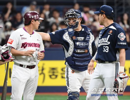 23일 서울 고척스카이돔에서 열린 두산-키움전. 2회말 1사 1루 임지열이 볼넷으로 출루하며 머리쪽으로 날라온 공에 대해 김유성에게 불만을 표했다. 양의지와 양석환이 사과하고 있다. 고척=정재근 기자 cjg@sportschosun.com/2025.4.23/