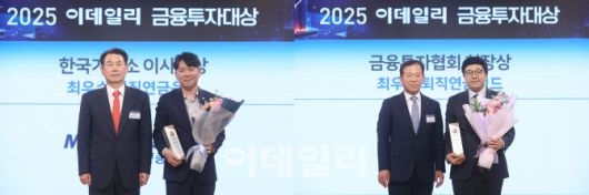 [이데일리 이영훈 기자] 23일 오후 서울 중구 KG하모니홀에서 열린 ‘2025 이데일리 금융투자대상’에서 정효영 미래에셋증권 본부장(왼쪽)이 한국거래소 이사장상 퇴직연금운용 부문 수상을 한 뒤 기념촬영을 하고 있다. 강영수 KCGI자산운용 본부장(오른쪽)은 금융투자협회 회장상 퇴직연금펀드 부문에서 수상했다. |