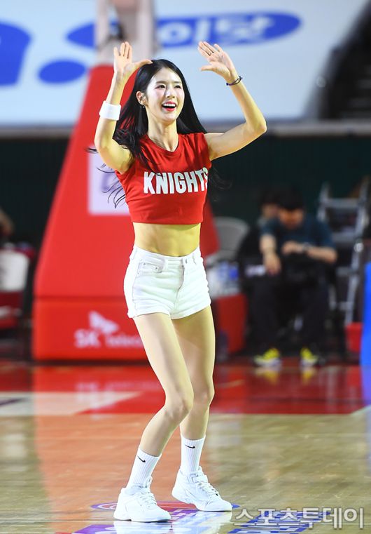 [스포츠투데이 팽현준 기자] 23일 서울 잠실 학생체육관에서 열린 2024-2025 프로농구 플레이오프 4강 서울 SK와 수원 KT의 경기, SK 박기량 치어리더가 응원하고 있다. 2025.04.23. [스포츠투데이 팽현준 기자 sports@stoo.com]