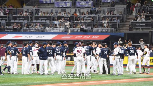 23일 고척스카이돔에서 열린 2025 KBO리그 두산과 키움의 경기 4회말 무사 두산 선발투수 김유성이 푸이그를 상대로 머리쪽 공을 던지다 벤치 클리어링이 발생해 양팀 선수들이 그라운드로 나와 있다. 푸이그는 2회말에도 김유성의 공에 맞고 출루한 바 있으며 두산 선발 김유성의 들쑥날쑥한 제구력에 결국 푸이그의 폭발로 이어져 양팀의 벤치클리어링으로 이어졌다. 2025. 4. 23.