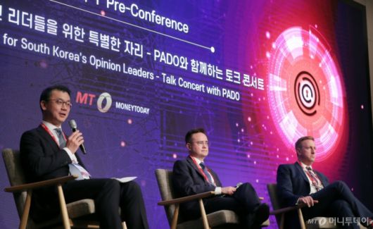 앤소니 킴 헤리티지재단 국제경제 선임연구원 및 국제협력매니저, 나일 가디너 헤리티지재단 마가렛 대처 자유 센터장, 에릭 혼츠 CIPE 책임투자센터 소장(왼쪽부터)이 23일 영등포구 콘래드 서울 호텔에서 머니투데이 주최로 진행된 '2025 키플랫폼' 사전행사 '대한민국 오피니언 리더들을 위한 특별한 자리-PADO와 함께하는 토크 콘서트'에서 트럼프 2기 시대의 한미 관계 전망에 대해 강연하고 있다. /사진=김창현 chmt@ |