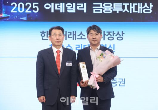 [이데일리 이영훈 기자] 김상수 메리츠증권 상무(오른쪽)가 23일 오후 서울 중구 KG하모니홀에서 열린‘2025 이데일리 금융투자대상’에서 한국거래소 이사장상 리테일혁신 부문 수상을 한 뒤 기념촬영을 하고 있다. |