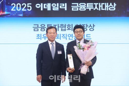 강영수 KCGI자산운용 본부장(오른쪽)이 23일 오후 서울 중구 KG하모니홀에서 열린‘2025 이데일리 금융투자대상’에서 금융투자협회 회장상 퇴직연금펀드 부문 수상을 한 뒤 기념촬영을 하고 있다. [이데일리 이영훈 기자] |