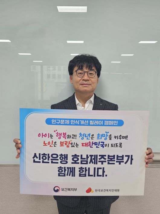 [헤럴드경제(광주)=서인주 기자] 신한은행 호남제주본부 김국환 본부장은 23일 보건복지부와 한국보건복지인재원이 공동주관하는 ‘인구문제 인식개선 릴레이 캠페인’에 동참했다.