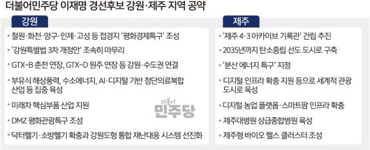 이 후보는 이날 사회관계망서비스(SNS)를 통해 강원·제주 지역을 겨냥한 공약도 발표했다. 강원 지역 공약의 키워드로 ‘미래산업’과 ‘글로벌관광’을 제시했고, 제주 지역 공약으로는 탄소중립 발전을 전면에 내세웠다. 두 지역 경선 결과는 오는 27일 수도권과 함께 민주당 경선 과정의 마지막 일정에서 발표된다.