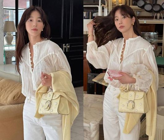 여기에 그녀는 파스텔 옐로 니트를 살짝 걸치고, 플라워 자수로 포인트를 준 버터 옐로 토트백을 더해 산뜻함을 배가시켰다.사진=기은세 SNS |