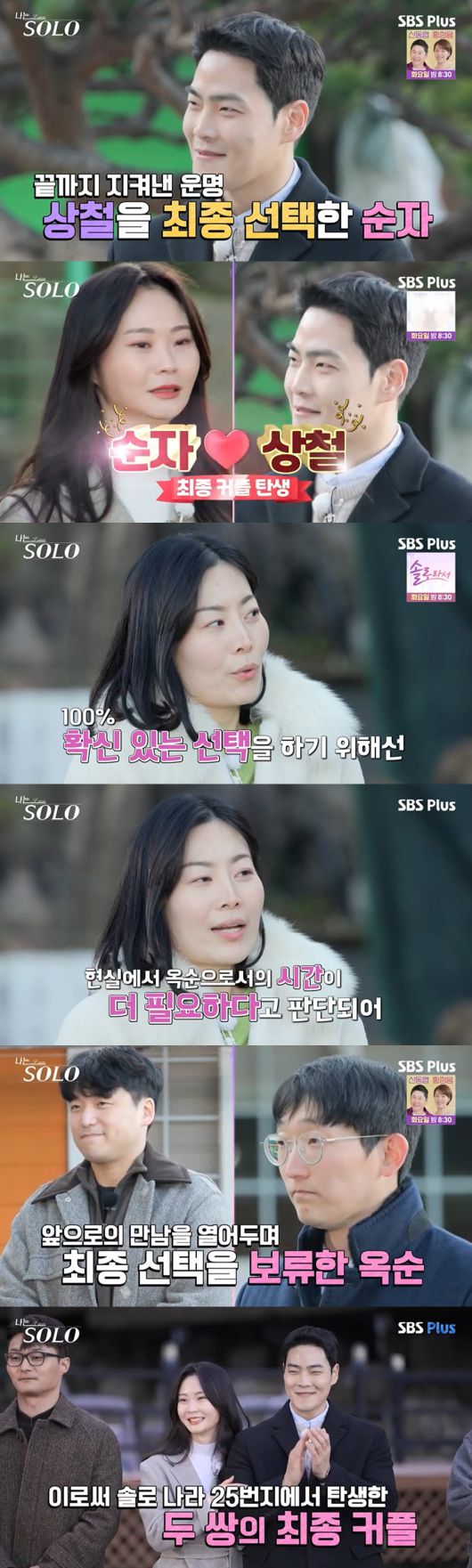 연이어 최종 선택을 포기하는 가운데, 상철은 일편단심으로 순자를 선택했다. 순자는 "처음부터 마지막까지 늘 설레게 해줘서 감사하다"며 울컥하는 모습을 보이더니 상철을 선택함으로써 최종 커플로 매듭지었다.