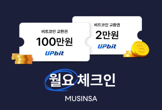 오는 28일 하루동안 진행되는 '월요 체크인' 이벤트를 통해 무신사는 총 20억원 상당의 비트코인 교환권을 경품으로 제공한다. '월요 체크인'은 무신사 회원 누구나 참여할 수 있는 선착순 경품 추첨 이벤트다.