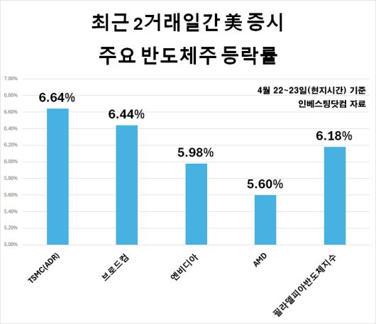22~23일(현지시간) 이어진 ‘훈풍’ 덕분에 미 증시 반도체주도 이틀간 그동안 부진을 털어내고 반등을 시도하는 모습을 보였다. 필라델피아반도체지수가 이틀간 6.18% 오른 가운데 TSMC(6.64%), 브로드컴(6.44%), 엔비디아(5.98%), AMD(5.60%) 등 주요 종목의 상승률도 6% 안팎을 기록하면서다.