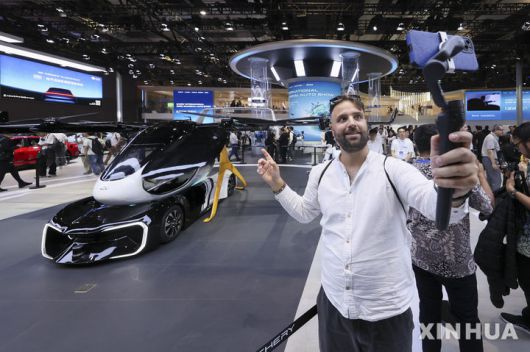 [상하이=신화/뉴시스] 23일 개막한 21회 상하이모터쇼에서 한 남성 관람객이 체리의 플라잉카를 실시간 동영상으로 소개하고 있다. 2025.04.24. |
