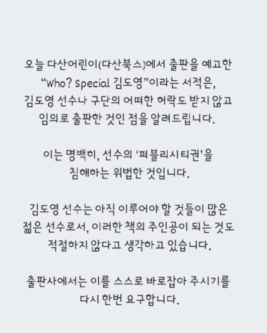 김도영의 에이전시인 MVP스포츠는 지난 23일 공식 SNS를 통해 "다산어린이(다산북스)에서 출판을 예고한 'Who? Special 김도영'이라는 서적은 김도영 선수와 구단의 어떤 허락도 받지 않고 임의로 출간했음을 알려드린다"며 "이는 명백히 선수의 '퍼블리시티권'을 침해하는 위법한 것"이라고 경고했다.