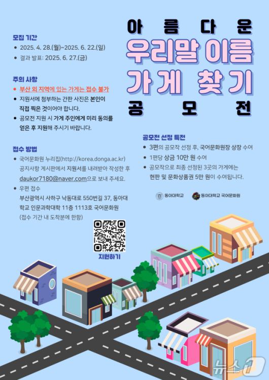 (부산=뉴스1) 윤일지 기자 = 동아대학교 국어문화원은 부산 시민을 대상으로 '2025년 아름다운 우리말 이름 가게 찾기 공모전'을 개최한다고 24일 밝혔다.