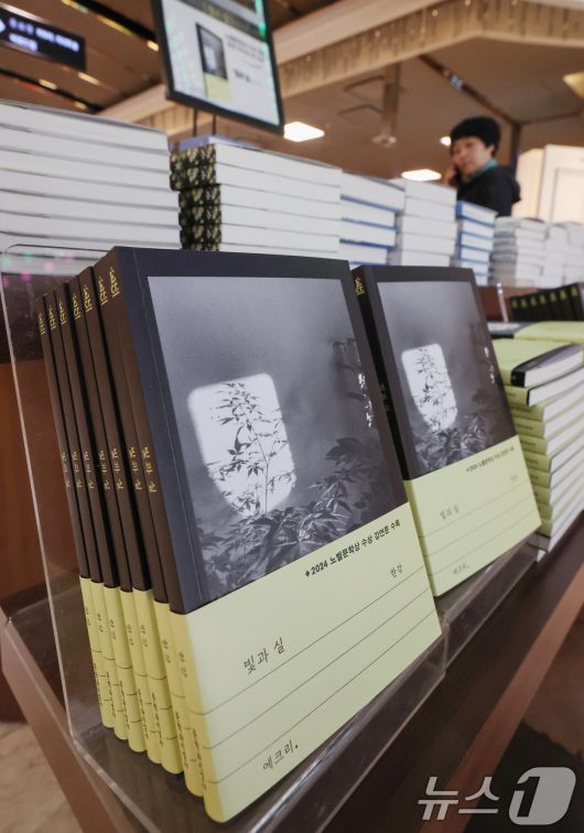 (서울=뉴스1) 민경석 기자 = 24일 오전 서울 종로구 교보문고 광화문점에 한강 작가의 신작 산문집 '빛과 실'이 진열돼 있다. 이번 신간은 노벨문학상 수상 강연문 '빛과 실'(2024)을 포함해 미발표 시와 산문, 그리고 작가가 자신의 온전한 최초의 집 '북향 방'과 '정원'을 얻고 써낸 일기를 포함한 총 열두 꼭지의 글이 사진과 함께 묶였다. 2025.4.24/뉴스1