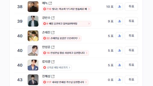 공동 40위에는 안성훈, 손태진 등 활발하게 활동하는 트로트 가수들도 있다. 비록 높은 순위는 아니지만, 조용한 팬들의 지지를 꾸준히 이어가고 있다는 점에서 의미 있는 성적이다. 이러한 투표 결과는 무대 위에서의 깊은 울림과 오랜 시간 다져온 음악적 진정성에 대한 대중의 인정을 보여준다.