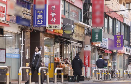 서울 용산구 한 공인중개사 사무소 앞으로 시민들이 이동하고 있다. |