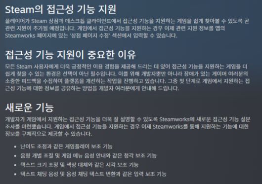 밸브는 접근성 기능 지원이 중요한 이유에 대해 "게임을 더 쉽게 찾을 수 있는 환경은 선택이 아닌 필수"라며 "뿐만 아니라 장애가 있는 게이머들의 소중한 피드백을 수집해 플랫폼을 개선하는 작업을 진행했다"라고 설명했다.