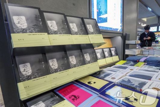 (서울=뉴스1) 민경석 기자 = 24일 오전 서울 종로구 교보문고 광화문점에 한강 작가의 신작 산문집 '빛과 실'이 진열돼 있다. 이번 신간은 노벨문학상 수상 강연문 '빛과 실'(2024)을 포함해 미발표 시와 산문, 그리고 작가가 자신의 온전한 최초의 집 '북향 방'과 '정원'을 얻고 써낸 일기를 포함한 총 열두 꼭지의 글이 사진과 함께 묶였다. 2025.4.24/뉴스1
