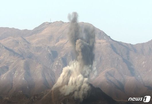 중부전선에서 북한측 GP 폭파가 이뤄지고 있다. (국방부 영상 캡처) 2018.11.20/뉴스1 |