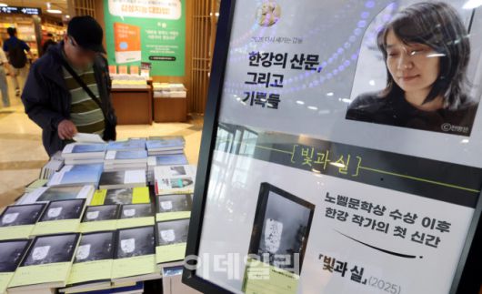 [이데일리 방인권 기자] 작가 한강이 노벨문학상을 받은 뒤 처음으로 선보인 신간 '빛과 실'이 24일 서울 종로구 교보문고 광화문점에 진열되어 있다. 이번 신간은 노벨문학상 수상 강연문 '빛과 실'(2024)을 포함해 미발표 시와 산문, 그리고 작가가 자신의 온전한 최초의 집 '북향 방'과 '정원'을 얻고 써낸 일기를 포함한 총 열두 꼭지의 글이 사진과 함께 묶였다.
