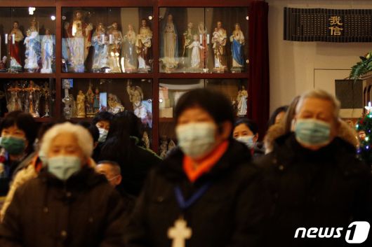 마스크를 쓴 예배자들이 2021년 12월 24일 중국 베이징 왕푸징 거리에 있는 요셉 교회에서 크리스마스 이브 미사에 참석하고 있다. ⓒ 로이터=뉴스1 ⓒ News1 김지현 기자 |