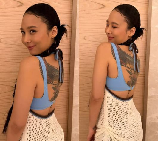 공개된 사진 속에는 비비의 소속사 사장이자 래퍼 윤미래가 등 뒤에 문신을 자랑하며 포즈를 취하고 있는 모습. 특히 비비는 사장을 어려워하지 않고 친근하게 대해 눈길을 끌었다.