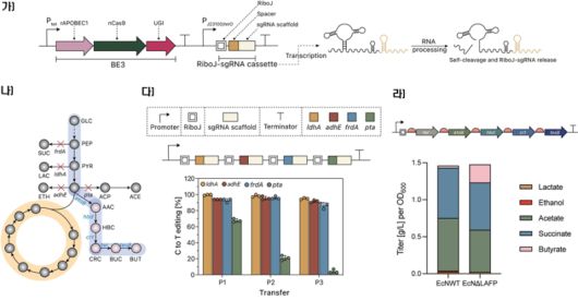 이 기술을 대장균에 적용한 결과 한 번에 6개 이상의 유전자를 동시에 편집해 부티르산 생산량을 최대 7배 증가시켰고, 아세트산 소비도 조절해 전체 대사경로 최적화에도 성공했다.
