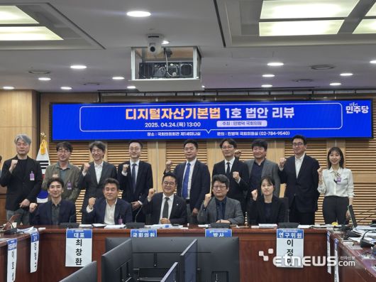 24일 국회 제1세미나실에서 열린 '디지털자산기본법 1호 법안 리뷰'에서 민병덕 의원(앞줄 왼쪽에서 세 번째)과 참석자들이 기념사진을 찍고 있다. (사진=박유민 기자) |