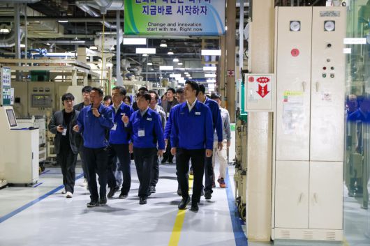 (맨 오른쪽부터)김익환 한세모빌리티 대표, 성낙곤 한세모빌리티 대표를 비롯한 관계자가 공장을 둘러보고 있다. |