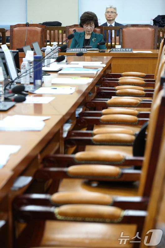 (서울=뉴스1) 이광호 기자 = 박선영 진실화해를위한과거사정리위원회 위원장이 24일 오후 서울 여의도 국회에서 열린 행정안전위원회 전체회의에서 신정훈 위원장의 퇴장 요청을 거부하며 자리를 지키고 있다. 2025.4.24/뉴스1skitsch@news1.krCopyright ⓒ 뉴스1. All rights reserved. 무단 전재 및 재배포, AI학습 이용 금지.
