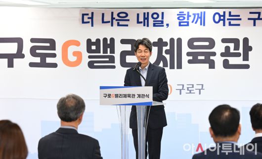 윤건영 더불어민주당 의원이 24일 오후 서울 구로구 구로G밸리체육관에서 열린 개관식에서 축사를 하고 있다. 구로구는 구민들과 구로디지털단지에서 근무하는 근로자들에게 안전하고 편리한 운동환경을 제공하기 위해 실내골프연습장과 기구필라테스, 헬스장, 카페테리아 등 다양한 시설을 갖춘 구로G밸리체육관을 조성해 이날 개관식을 진행했다. /정재훈 기자