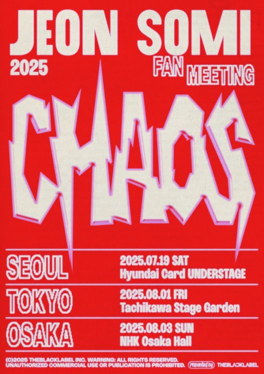 소속사 더블랙레이블은 24일 공식 SNS 채널에 '전소미 2025 팬미팅 '카오스'(JEON SOMI 2025 FAN MEETING 'CHAOS') 개최 소식을 알리며 포스터를 공개했다.
