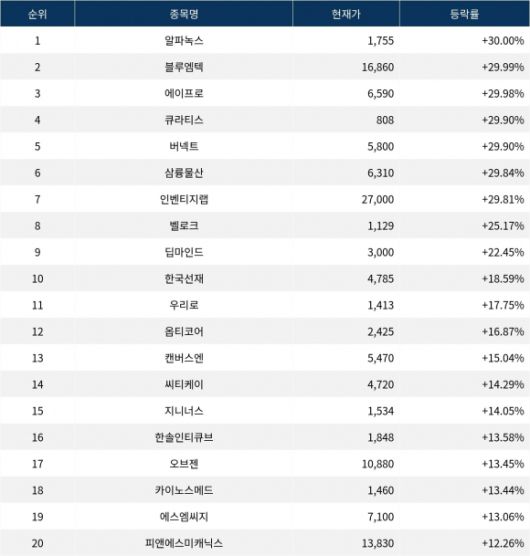 6위 삼륭물산(014970)은 종가 6,310원으로 29.84% 상승 마감했다. 7위 인벤티지랩(389470)은 종가 27,000원으로 29.81% 상승 마감했다. 8위 벨로크(424760)는 종가 1,129원으로 25.17% 상승 마감했다. 9위 딥마인드(223310)는 종가 3,000원으로 22.45% 상승 마감했다. 10위 한국선재(025550)는 종가 4,785원으로 18.59% 상승 마감했다.